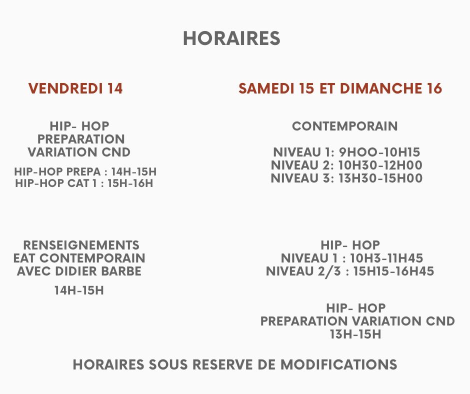 Et MALIKA , championne du monde de Hip Hop , donnera cours dans les 3 niveaux et apprendra, à ceux qui le souhaitent, les deux variations : préparatoire et Catégorie 1 pour le Concours CND , dont elle est la CHORÉGRAPHE.