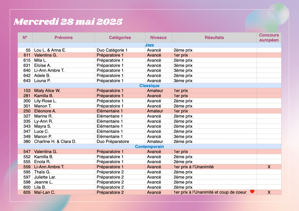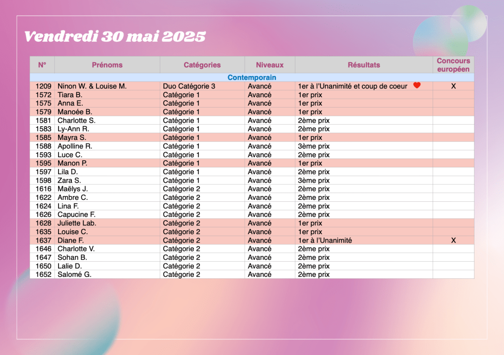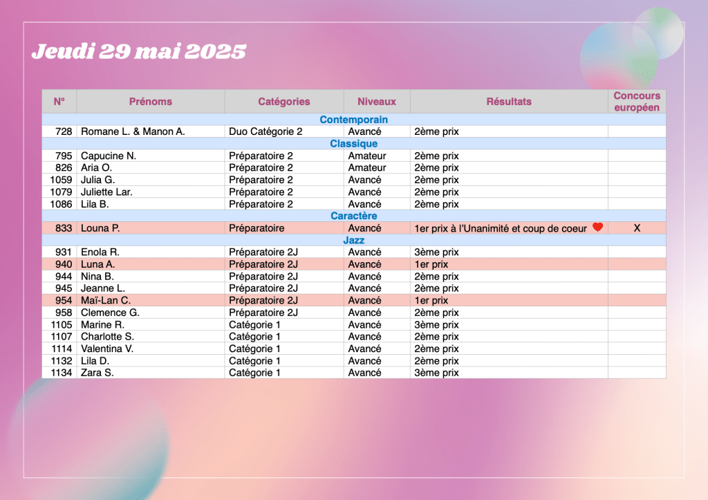 Nous les félicitons toutes les quatre car Louise et Li-Ann ont également brillé sur scène et leurs prestations ont été à la hauteur d’un concours très exigeant.